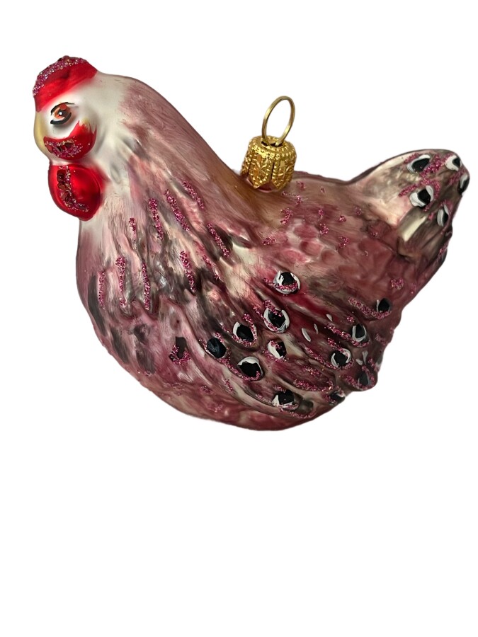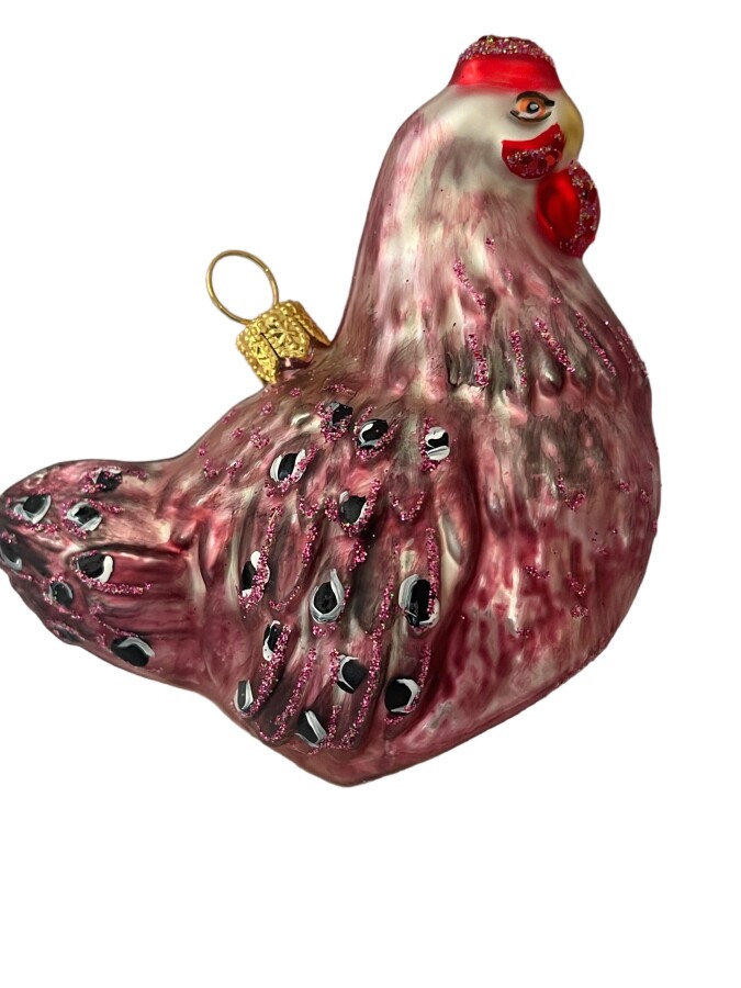 Diese charmante Henne aus Glas in zarter Rosa-Farbgebung ist ein stilvoller und zugleich verspielter Blickfang für deinen Weihnachtsbaum. Die fein schimmernden Rosatöne, kombiniert mit liebevoll gestalteten Federdetails und dem kleinen roten Kamm, verleihen diesem Ornament eine besonders warme und elegante Ausstrahlung.