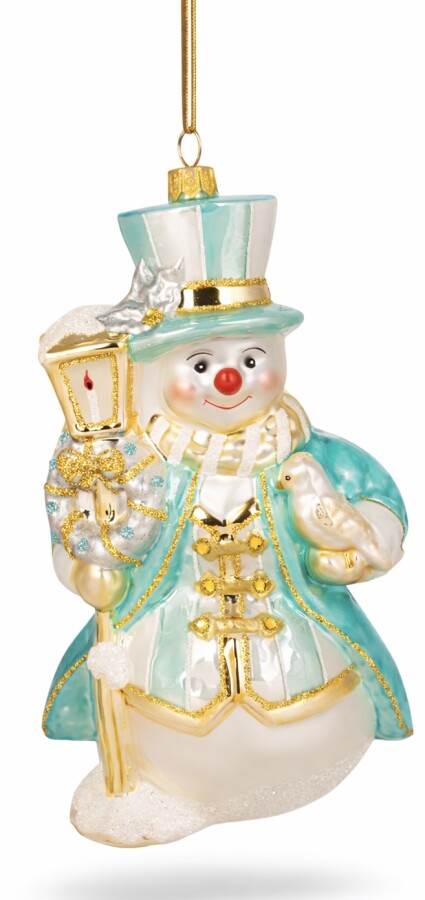 Dieser liebevoll gestaltete Schneemann ist ein zauberhaftes Glasornament und bringt winterliche Freude in Ihre Weihnachtsdekoration. Mit seinem freundlichen Gesichtsausdruck, der detailreichen Kleidung und den edlen Verzierungen wird er zu einem besonderen Blickfang am Christbaum.